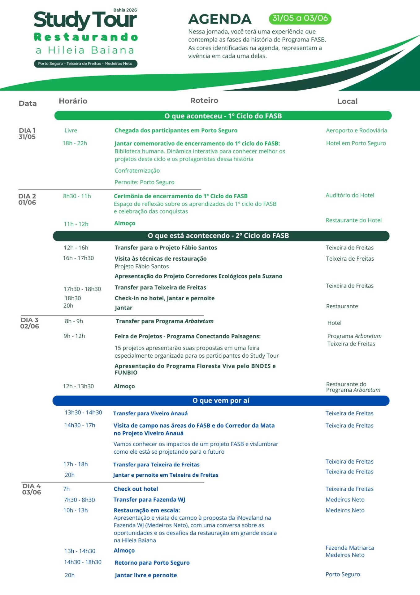 O Study Tour 2026 iniciará no município de Porto Seguro, com visitas à projetos nos municípios de Teixeira de Freitas e Medeiros Neto, todos na região sul e extremo da Bahia. São áreas que pertencem à cobertura da Mata Atlântica chamada Hileia Baiana.